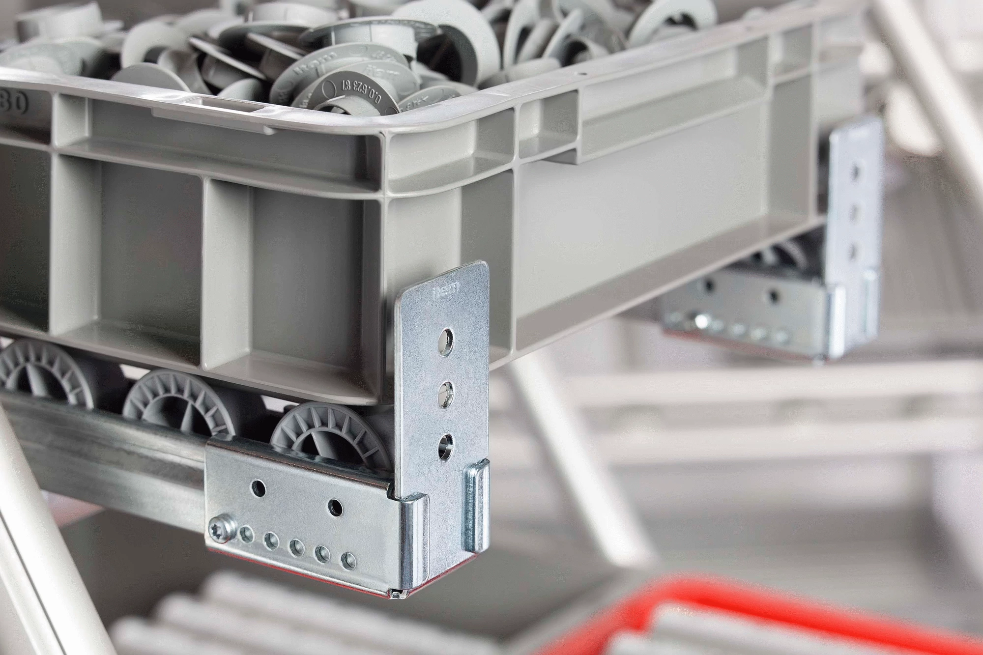 As Roller Conveyor St Stop H43 is not mounted to a crossmember, users can build roller conveyors that project outside a frame and thus reduce reaching distances. Light transport boxes are brought safely to a halt. The stop must be screwed to the Roller Conveyor St D30.